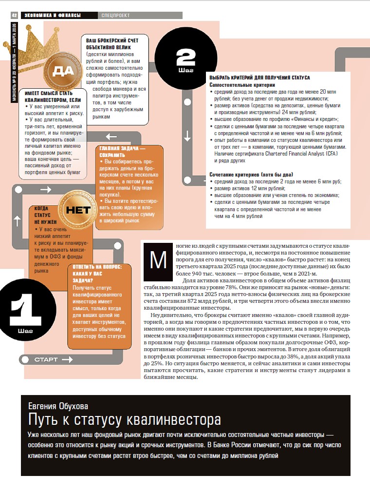 Многие из людей с крупными счетами задумываются о получении статуса квалифицированного инвестора, и, несмотря на постоянное повышение порога для его получения, число «квалов» быстро растет: на конец 3 квартала 2025 года (последние доступные данные) их было более 940 тыс. человек — втрое больше, чем в 2021 году. Доля активов квалинвесторов в общем объеме активов физлиц стабильно находится на уровне 78%. Они же приносят на рынок «новые» деньги: так, за третий квартал 2025 года нетто-взносы физических лиц на брокерские счета составили 872 млрд рублей, и три четверти этого объема внесли именно квалифицированные инвесторы. Неудивительно, что брокеры считают именно «квалов» своей самой главной аудиторией, а когда мы говорим о предпочтениях частных инвесторов и том, что они покупают и какие стратегии предпочитают, мы в первую очередь говорим о квалифицированных инвесторах с крупными счетами. Например, в прошлом году физлица главным образом покупали долгосрочные ОФЗ, корпоративные облигации — банков и прочих эмитентов. В итоге доля облигаций в портфелях розничных инвесторов быстро выросла до 38%, а доля акций упала до 25%. Но ситуация быстро меняется, и сейчас аналитики и сами инвесторы пытаются просчитать, какие стратегии и инструменты станут лидерами в ближайшие месяцы.
