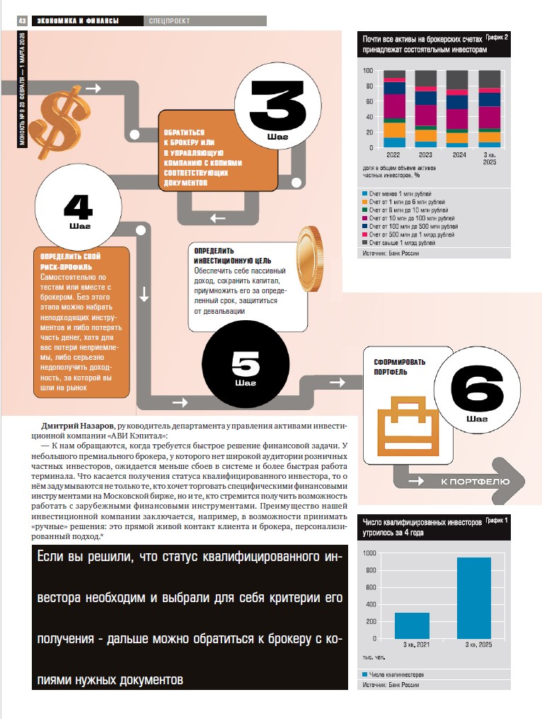 Дмитрий Назаров, руководитель департамента управления активами инвестиционной компании «АВИ Кэпитал»: «К нам обращаются, когда требуется быстрое решение финансовой задачи. У небольшого премиального брокера, у которого нет широкой аудитории розничных частных инвесторов, ожидается меньше сбоев в системе и более быстрая работа терминала. Что касается получения статуса квалифицированного инвестора, то о нём задумываются не только те, кто хочет торговать специфическими финансовыми инструментами на Московской бирже, но и те, кто стремится получить возможность работать с зарубежными финансовыми инструментами. Преимущество нашей инвестиционной компании заключается, например, в возможности принимать «ручные» решения: это прямой живой контакт клиента и брокера, персонализированный подход.»