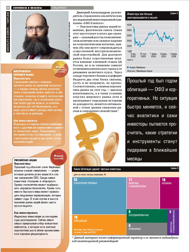 Дмитрий Александров, руководитель управления аналитических исследований инвестиционной компании «АВИ Кэпитал»: «Перспективы рынка акций туманные, фактически сквозь туман этот проступает в итоге два сценария – сильный рост на геополитическом позитиве или сильное падение на геополитическом негативе, причём оба они могут сопровождаться существенной внутриэкономической перестройкой. Для долгового рынка более существенным является влияние ключевой ставки ЦБ РФ, но и её снижение зависит от внешнеполитического трека и динамики валютного курса. Через сальдо торгового баланса и дефицит бюджета два этих блока связаны, пусть и не напрямую, но крепко. Соответственно, основная перспектива рынка на этот год – высокая волатильность, а в таких условиях покупка широкого рынка хотя и проигрывает отдельным историям по доходности, является оптимальной с точки зрения снижения рисков и сохранения спокойствия».
