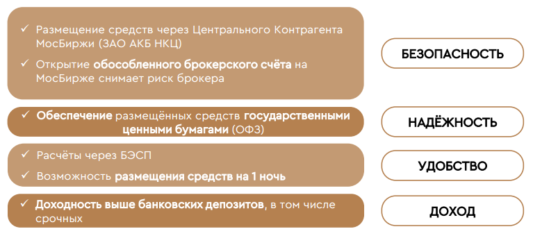 - Возможность размещения средств по реальной рыночной ставке на Московской Бирже