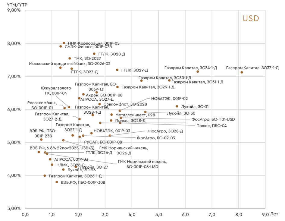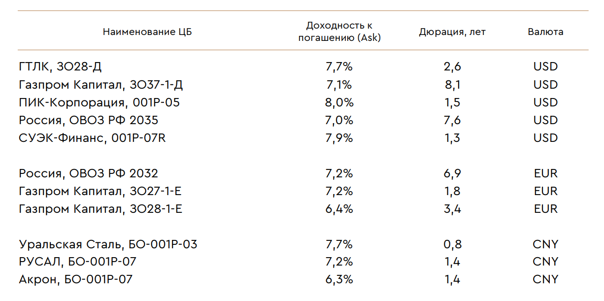 Приведённый набор сочетает в себе повышенную доходность и широкий диапазон сроков до погашения, что позволяет формировать как консервативный среднесрочный портфель на длительный горизонт, так и использовать отдельные инструменты для целенаправленного хеджирования изменений курса или использования валютных колебаний в спекулятивных целях, с получением дополнительной доходности.